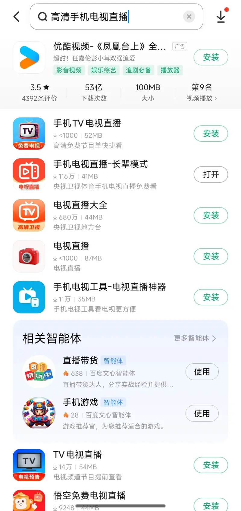 安卓的话,去应用商店搜一下“手机电视高清直播”,选几个下载,两三个里面最少有一个能用的